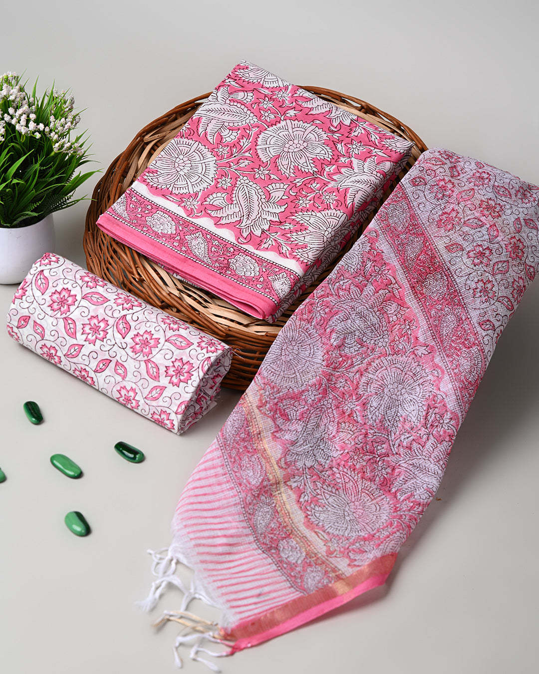Premium Pink Floral Sanganeri Print Cotton Suit With Kota Doria Dupatta (EACOTKO08)