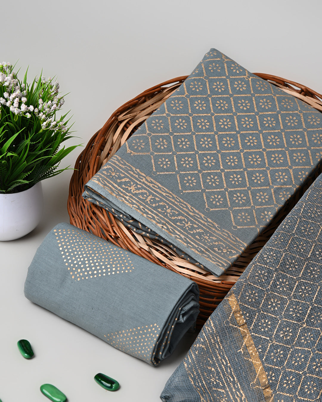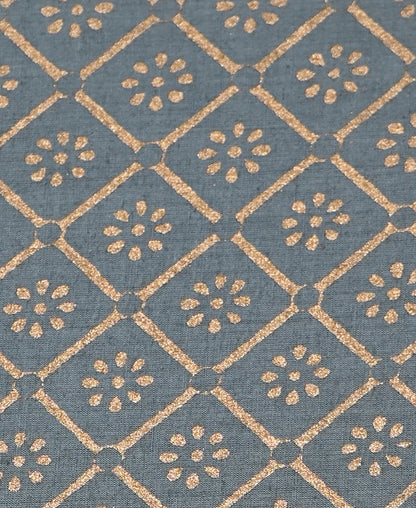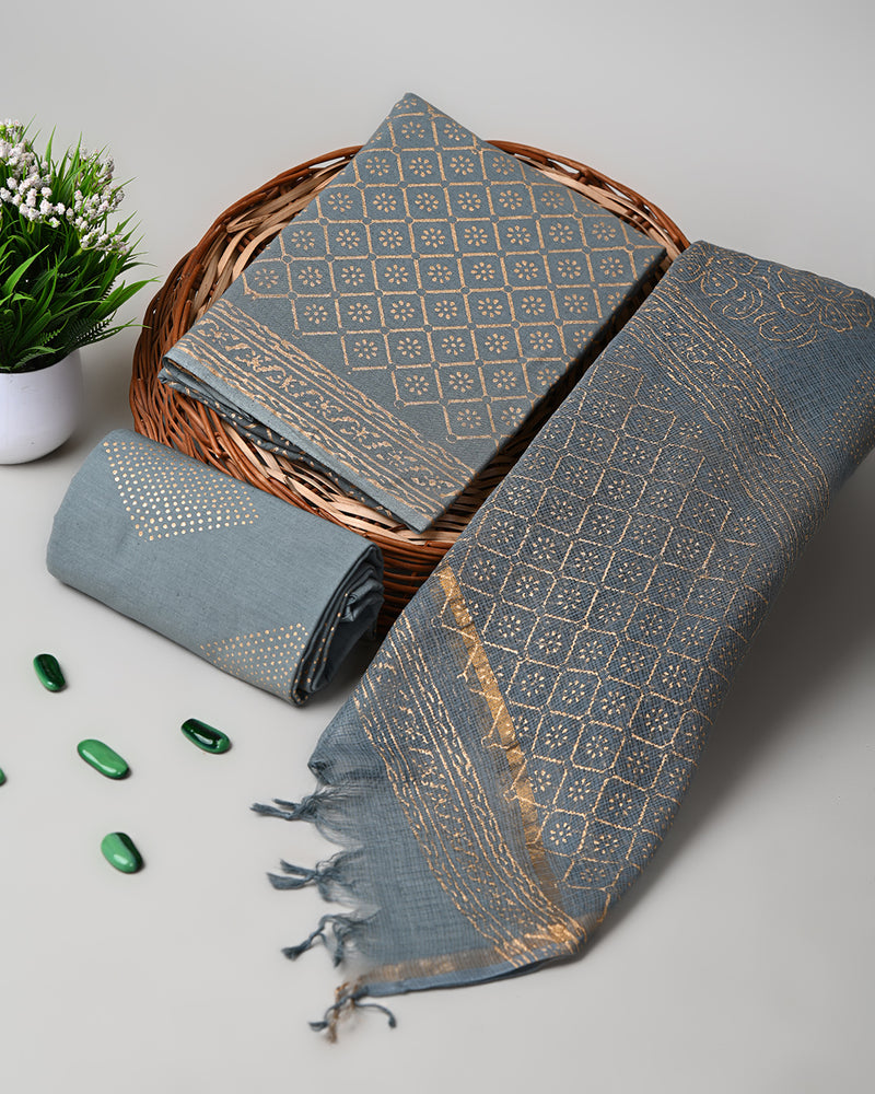 Premium Grey With Golden Sanganeri Print Cotton Suit With Kota Doria Dupatta (EACOTKO14)